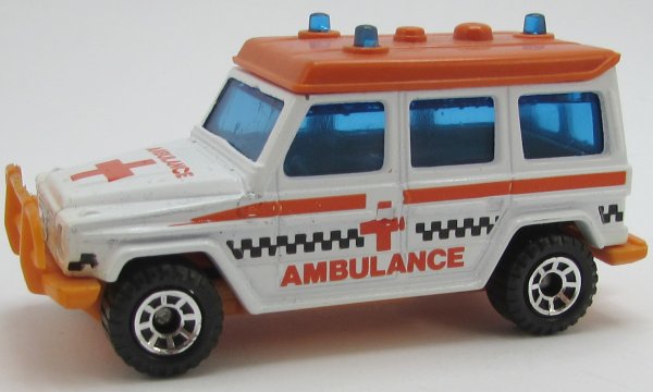 white, orange roof, blue roof lights, black checkers with orange cross, AMBULANCE tampo |