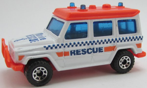 white, fluorescent orange roof, blue roof lights, dark blue MARINE RESCUE and blue checkers tampo |