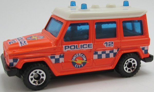 fluorescent orange, white roof, blue roof lights, POLICE 12 and INTERCOM CITY tampo |