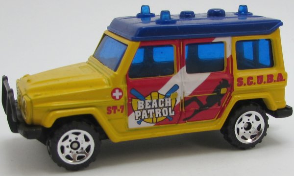 dark yellow, blue roof, blue roof lights, BEACH PATROL / S.C.U.B.A. tampo |