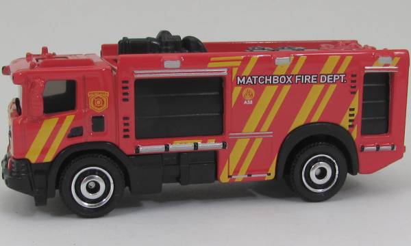 | red, MATCHBOX FIRE DEPT., yellow stripes |