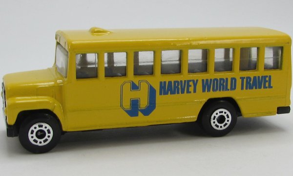 yellow, silver grille, filled lower rear door window, HARVEY WORLD TRAVEL tampo |