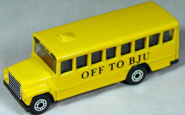orange-yellow, silver grille, filled lower rear door window, OFF TO BJU / BOB JONES UNIVERSITY (black, left / right) tampo |