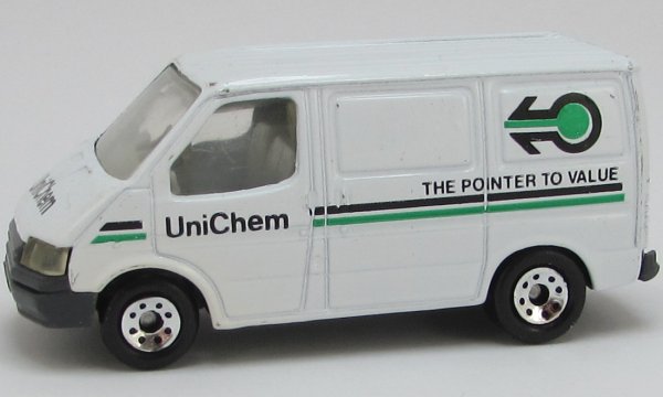 white, with TRANSIT at rear, UNICHEM with black and green stripes tampo |