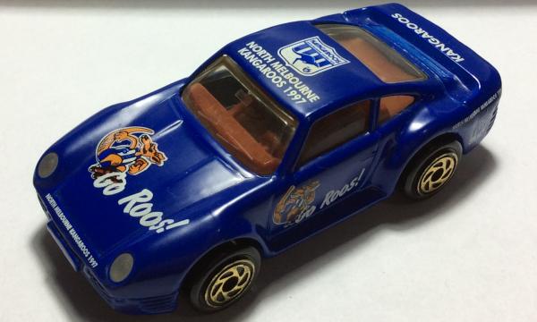 bright blue, cast rear spoiler, no license plate cast, GO ROOS! 1997, silver headlights tampo |