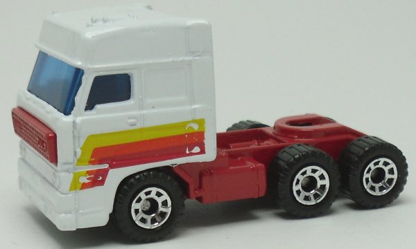 | white, red chassis, yellow, orange, red stripes |