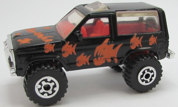 black, chrome grille, orange PIRANHA on hood, fish design on sides tampo |
