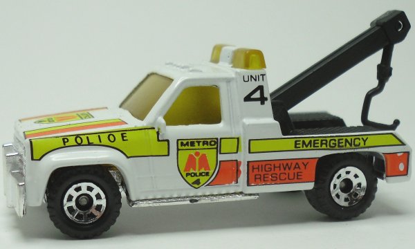 white, chrome plastic grille, cloudy amber roof light, black rear area, black boom, black tow hook, POLIOE / METRO EMERG. ("O" not "C") tampo |
