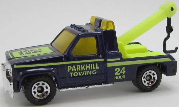 dark purple, chrome plastic grille, cloudy amber roof light, neon yellow rear area, neon yellow boom, black tow hook, PARKHILL TOWING / 24 HOUR tampo |