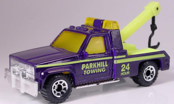 purple, chrome plastic grille, cloudy amber roof light, neon yellow rear area, neon yellow boom, black tow hook, PARKHILL TOWING / 24 HOUR without hood design tampo |