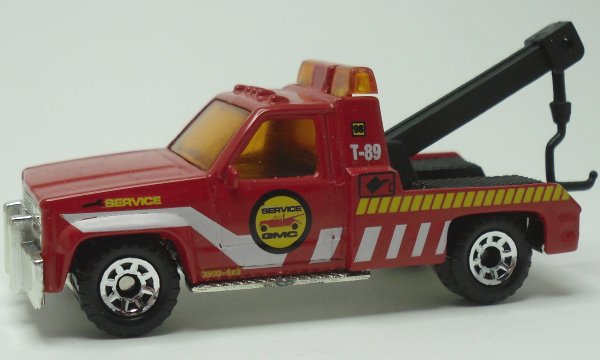 red, chrome plastic grille, amber roof light, black rear area, black boom, black tow hook, SERVICE GMC with yellow and white design tampo |