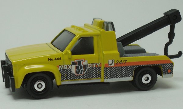 yellow, black grille, smoke roof light, gray rear area, black boom, black tow hook, MBX TOW CITY and hashmarks tampo |