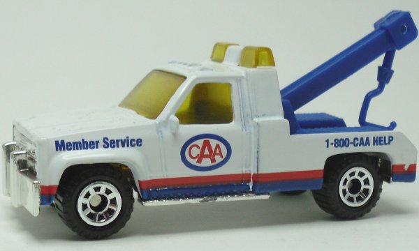 white, chrome plastic grille, cloudy amber roof light, blue rear area, blue boom, blue tow hook, CAA MEMBER SERVICE, blue lettering tampo |