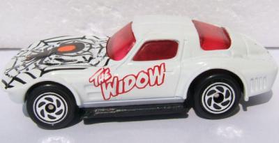 white, no rear license plate cast, red outlined THE WIDOW with spider and web tampo |
