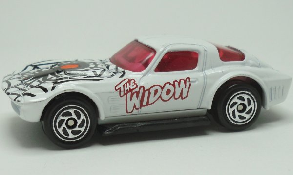 white, no rear license plate cast, red outlined THE WIDOW with spider and web tampo |