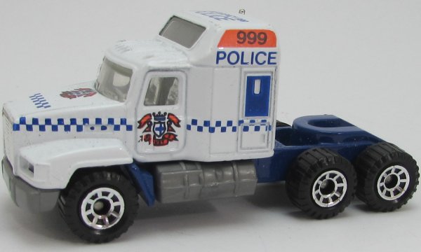 white, blue chassis, blue checkers and POLICE and 999 tampo |