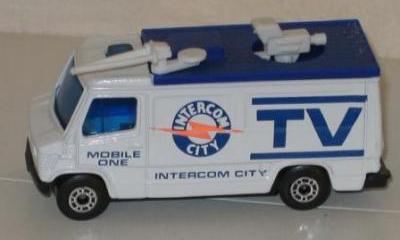 white, dark blue roof, white roof units, Mercedes logo grille, INTERCOM CITY TV tampo |