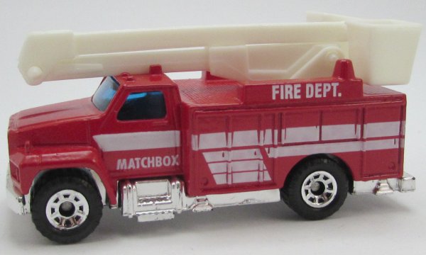 red, white turret, white boom, white bucket, MATCHBOX FIRE DEPT., white stripes deco |