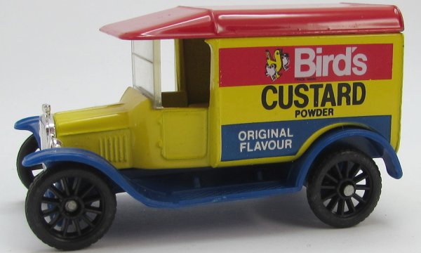| yellow, red roof, BIRD'S CUSTARD POWDER, red and blue stripes |