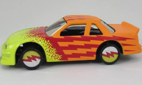 fluorescent yellow and orange, no driver name, red spatter and lightning bolts tampo |