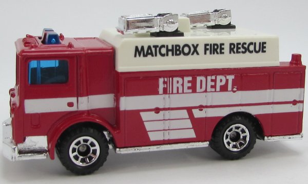 red, white roof, silver and black roof fixtures, MATCHBOX FIRE RESCUE / FIRE DEPT. tampo |