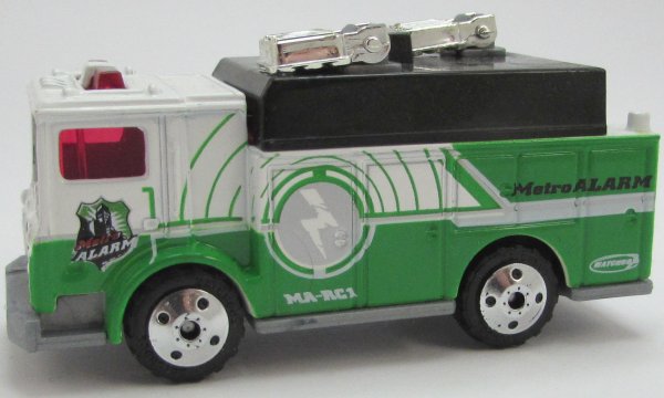 white and green, black roof, silver and gray roof fixtures, METRO ALARM, MB logo tampo |