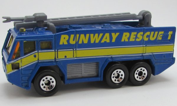 bright blue, silver-gray ladder nozzle, amber roof lights, RUNWAY RESCUE 1, yellow band tampo |