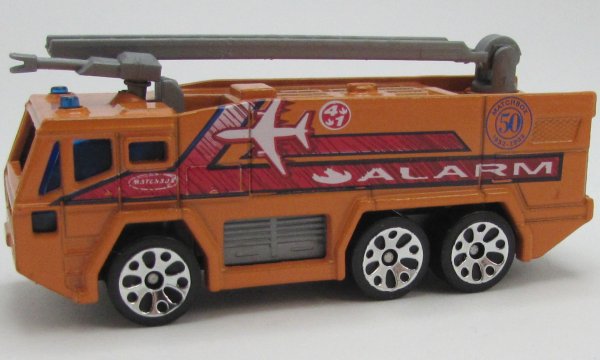 orange, silver-gray ladder nozzle, blue roof lights, ALARM, red stripes, airplane, 50 logo on left side at rear tampo |