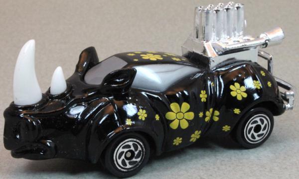 black, silver engine, silver rear bumpers, white horns, white eyes, yellow flowers tampo |