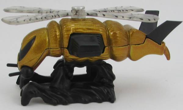 | metallic gold lower body, metallic gold upper body, black rear mid fins, colorless with black veins wings |
