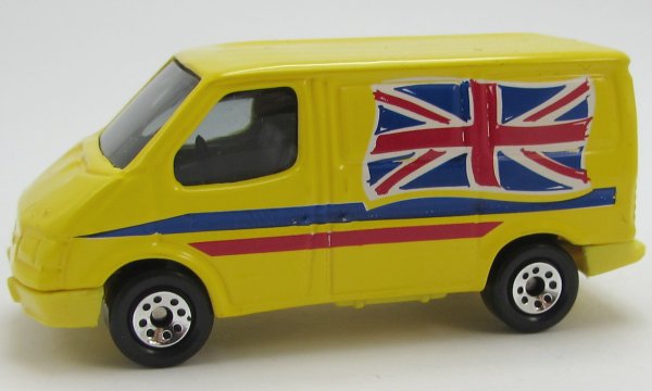 yellow, with TRANSIT at rear, Union Jack, blue and red stripes tampo |