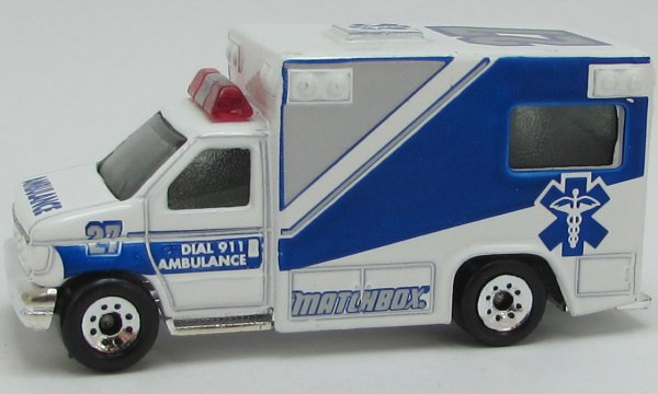 white, red, silver center roof lights, 27 MATCHBOX AMBULANCE with blue and silver design tampo |