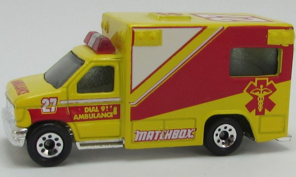 yellow, red, silver center roof lights, 27 MATCHBOX AMBULANCE with red and white design tampo |