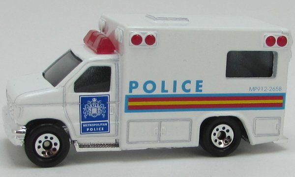 white, red roof lights, POLICE, red, yellow and blue stripes tampo |