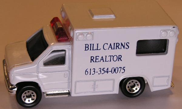 white, red, silver center roof lights, BILL CAIRNS REALTOR (black, sides) tampo |