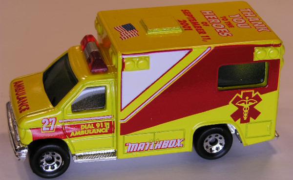 yellow, red, silver center roof lights, 27 MATCHBOX AMBULANCE, THANK YOU HEROES tampo |