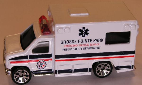 white, red roof lights, GROSSE POINT PARK AMBULANCE tampo |