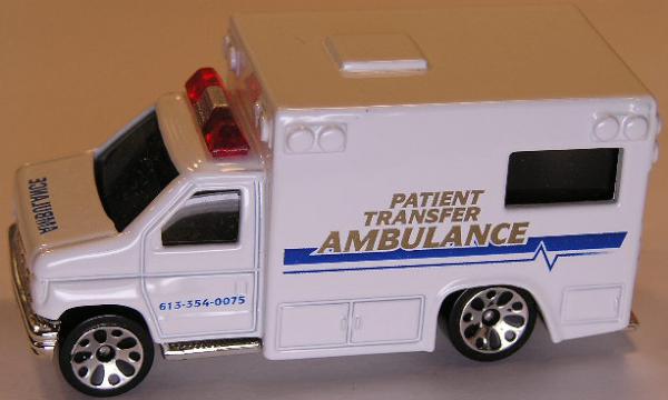 white, red roof lights, PATIENT TRANSFER AMBULANCE tampo |