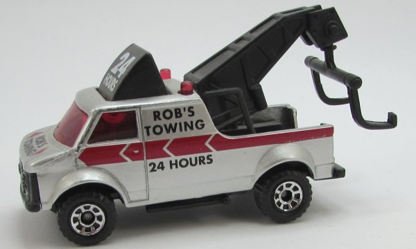 silver-gray, black boom roof mount, black tow hook, ROB'S TOWING 24 HOURS tampo |