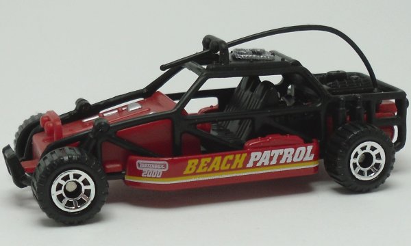 red, black roll cage, black antenna, BEACH. MATCHBOX 2000 tampo |