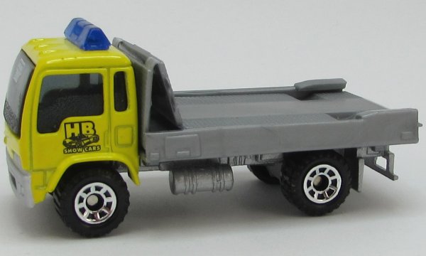 yellow cab, gray flatbed ramp, blue roof light, HB SHOW CARS, MATCHBOX 2000 tampo |