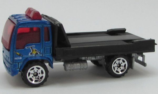 metallic blue cab, black flatbed ramp, red roof light, monkey and wrench design tampo |