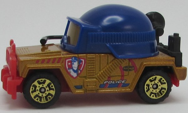 metallic gold, blue helmet, POLICE, shield, black Matchbox logo tampo |