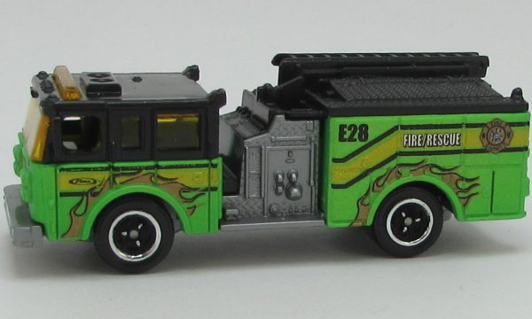 lime green, black cab roof, black rear cap, FIRE / RESCUE, flames tampo |