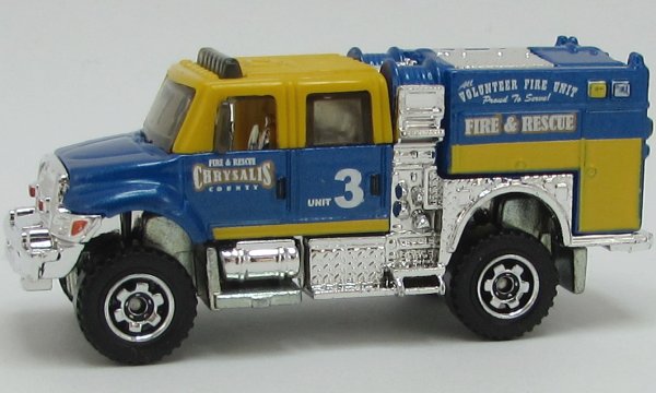 metallic blue, orange-yellow cab roof, chrome chassis, CHRYSALIS FIRE and RESCUE 3 tampo |