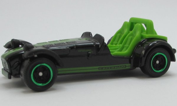 black, black front fenders, green stripes and CATERHAM tampo |