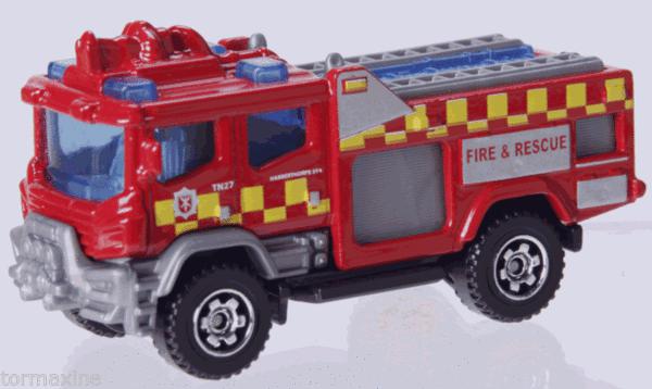 red, gray front fenders, yellow checkers, FIRE & RESCUE tampo |