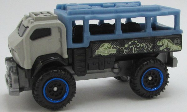 black, matte gray cab, black fenders, light blue cage, JURASSIC WORLD tampo |