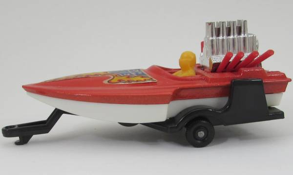 white hull, red deck, filled engine block, red exhausts, SEAFIRE, black plastic trailer |
