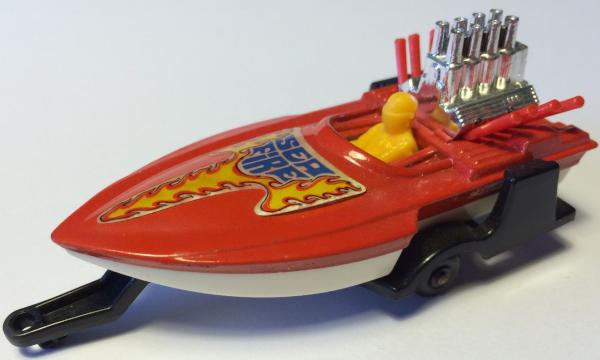 white hull, dark red deck, filled engine block, red exhausts, SEAFIRE, black plastic trailer |